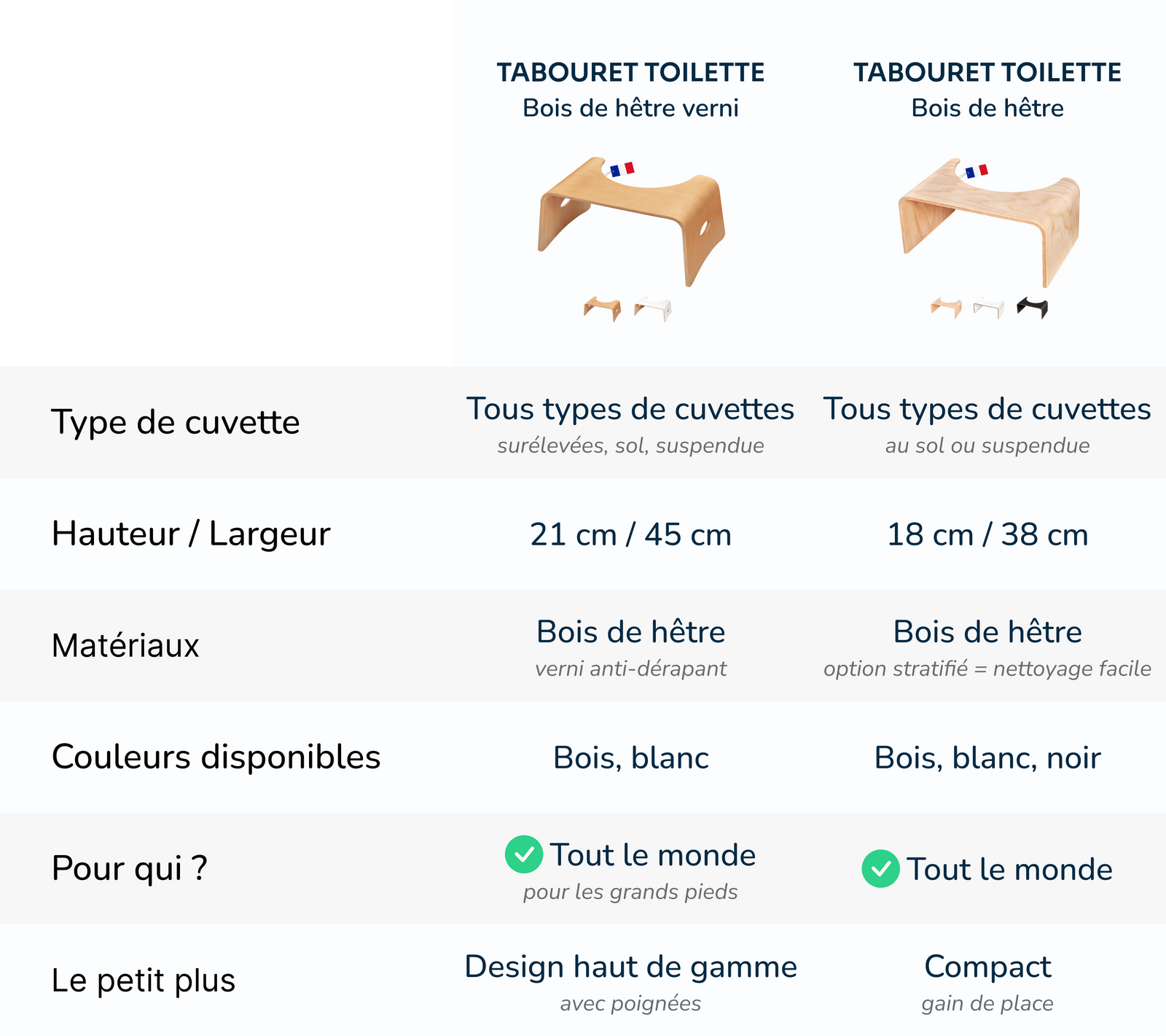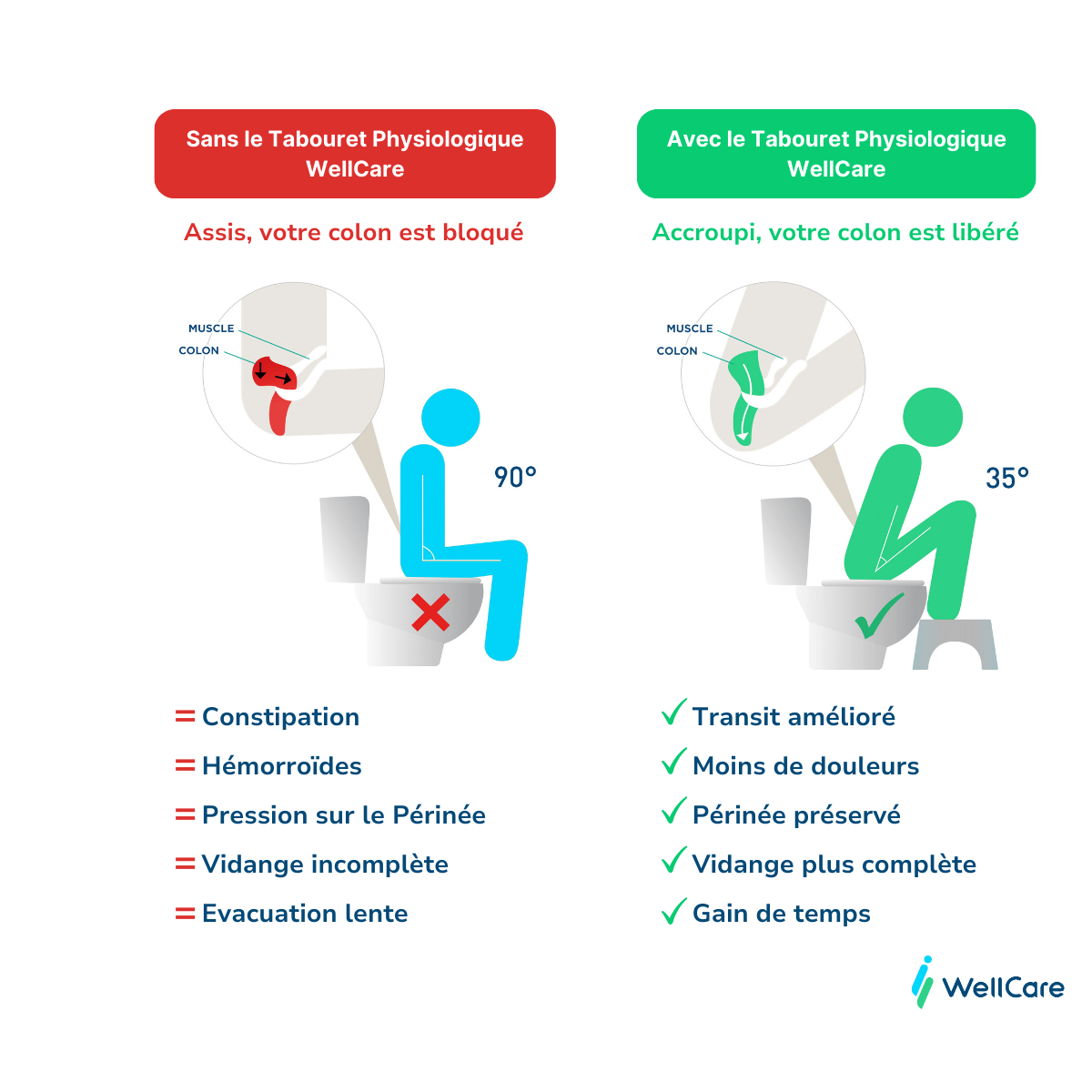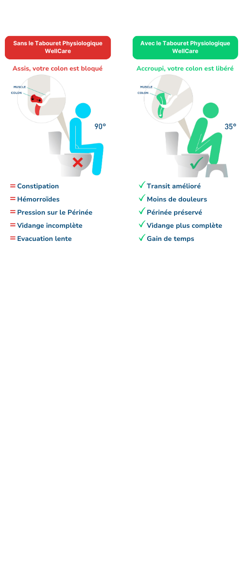Approuvé et encouragé par les professionnels de la santé, notre tabouret physiologique fait des merveilles pour votre posture. Il vous aide à vous mettre en position accroupie naturelle pour un transit plus doux avec moins de tension. C'est un petit pas pour un grand confort !